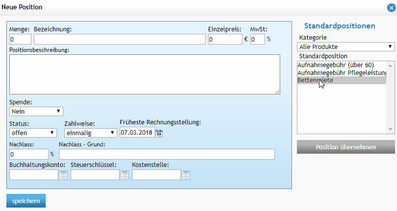 (Wenn es Rechnungspositionen gibt, die Sie öfters verwenden möchten und diese nicht als Standardposition definiert sind, wenden Sie sich an den Support)