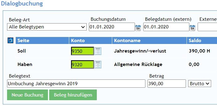 Bei Verwendung von Bilanzkonten muss der erwirtschaftete Gewinn oder Verlust manuell auf ein Rücklagen-Konto gebucht werden. Als Vorbereitung dafür ist zu empfehlen, dass die zuvor beschriebenen Eröffnungsbuchungen bereits durchgeführt wurden. Für das Buchen des Vorjahres-Ergebnisses kann wie folgt vorgegangen werden: