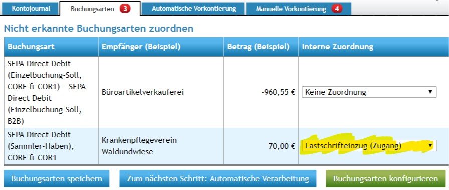 - Für jene Kontozeile, welche den Lastschrift-Zahlungseingang darstellt, muss einmalig die Buchungsart zugeordnet worden sein. Dazu in