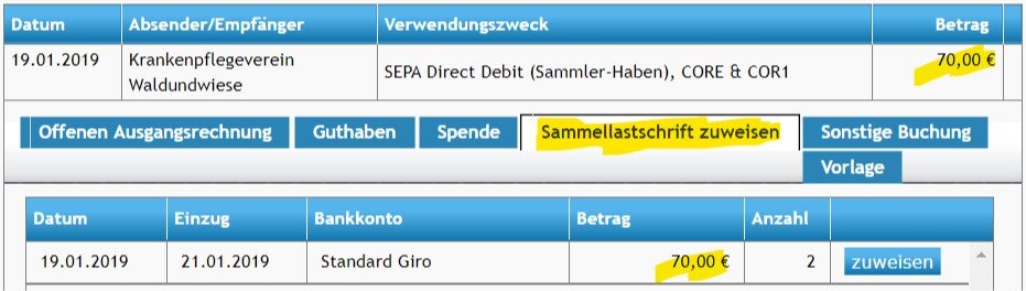 Sammellastschrift zuweisenangezeigt werden. Ist das nicht der Fall, wurde die Buchungsart noch nicht gespeichert. Siehe dazu oben bei Voraussetzungen den Punkt 3. - Es muss weiters der Betrag des Zahlungseingang mit dem Betrag für die Zuweisung übereinstimmen