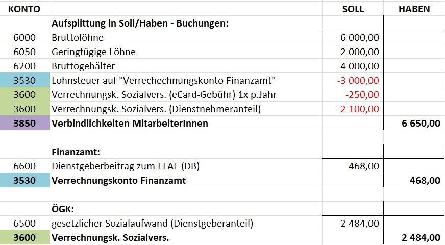 Hier zuerst eine Übersicht für ein einfaches Beispiel einer Lohn-/Gehaltsabrechnung am Monatsende. Daraus ist ersichtlich, dass es drei Buchungen gibt. Die erste Buchung betrifft den Lohn und hat die Besonderheit, dass manche Beträge mit MINUS auf der SOLL-Seite eingetragen werden, weil nicht gleichzeitig auf SOLL- und HABEN-Seite gesplittet werden kann. Die weiteren beiden Buchungen betreffen einmal das Finanzamt und einmal die Krankenkasse.