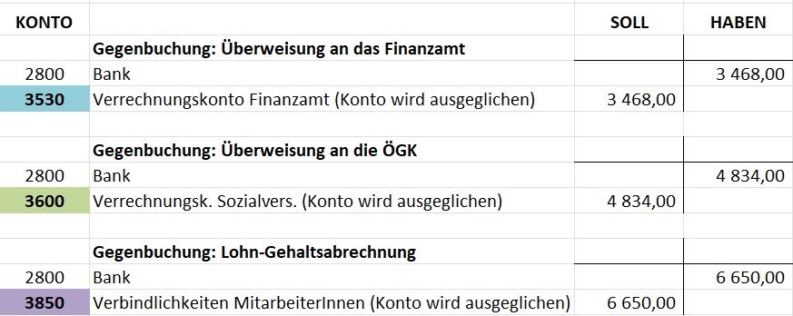Die Zahlungen im Kontojournal werden als Gegenbuchungen auf die Verrechnungskonten für Finanzamt und Krankenkasse durchgeführt. Ebenso erfolgt eine Gegenbuchung für die MitarbeiterInnen-Verbindlichkeiten. Hier die Weiterführung des Beispiels: