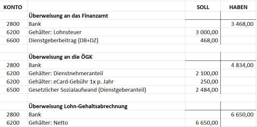 Hier ist das Vorgehen für das Buchen der Lohnabrechnung beschrieben. Dabei wird für das Finanzamt und für die Krankenkasse jeweils ein Verrechnungskonto verwendet. Der Ablauf ist so, dass zuerst in der Buchhaltung anhand des Beleges der Lohnabrechnung gebucht wird. Danach – wenn die entsprechenden Zahlungen im Kontojournal stehen – werden die entsprechenden Gegenbuchungen durchgeführt.