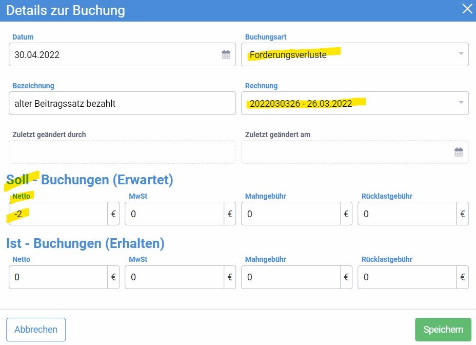Buchungsartden Eintrag Forderungsverluste wählen - Bei Bezeichnung z.B. alter Beitragssatz bezahlt eingeben