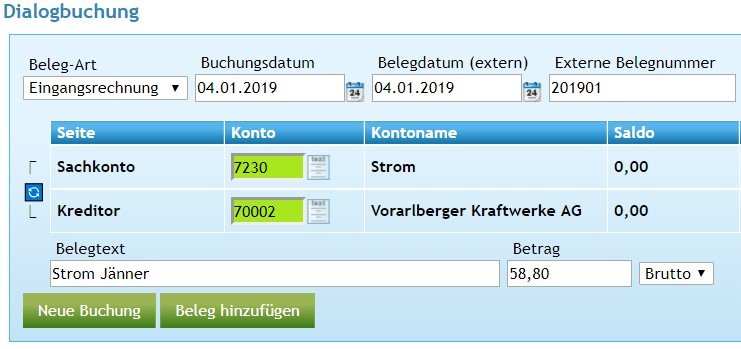 Gegenkontodas Kreditor-Konto wählen. Falls das Kreditor-Konto nicht vorhanden ist, müssen Sie den Lieferant wie oben beschrieben erfassen. - Die Felder