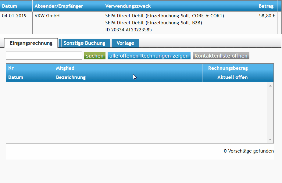 Eingangsrechnungsuchen, ob die Rechnung bereits erfasst wurde. Hier ist die Rechnung nur bei Verwendung der speziellen Funktion “Eingangsrechnungserfassung”, welche standardmäßig NICHT freigeschalten ist. - Wenn – im Standardfall – keine Eingangsrechnung erfasst wurde, das Register